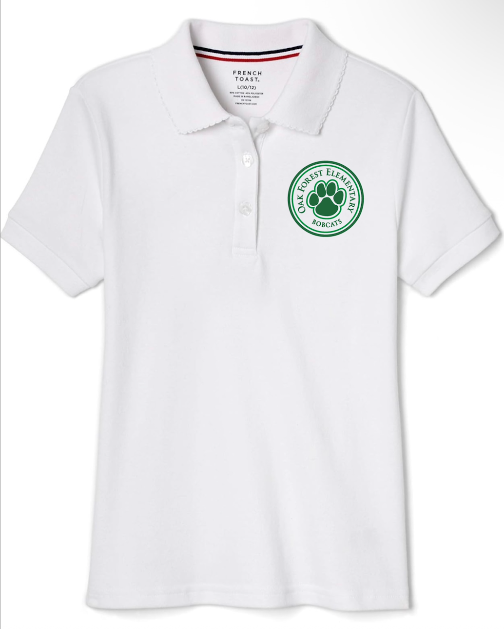 Embroidered Oak Forest Elementary white polo with scalloped edging on the collar and flower-shaped buttons on the placket. Cotton-blend interlock fabric gives this polo shirt a soft, smooth feel.